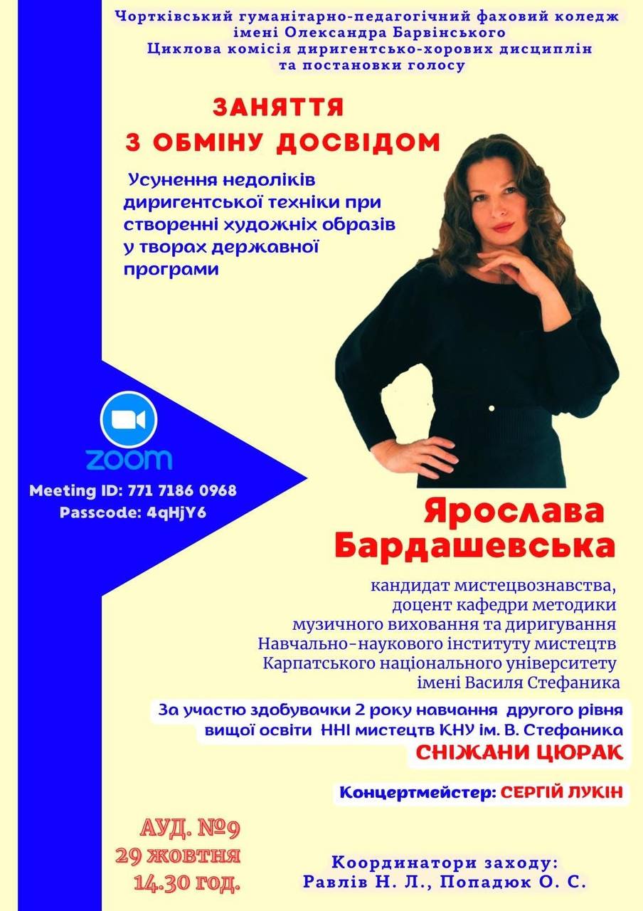 29 жовтня 2025 р. в рамках проведення тижня диригентсько–хорових дисциплін та постановки голосу в Чортківському гуманітарно-педагогічному коледжі ім. О. Барвінського  відбулося консультативне відкрите заняття, яке провела Бардашевська Ярослава Миколаївна, випускниця цього навчального закладу, а нині – кандидат мистецтвознавства, доцент кафедри методики музичного виховання та диригування Навчально-наукового інституту мистецтв Карпатського національного університету імені Василя Стефаника.  Захід відбувався в онлайн форматі на платформі Zoom. Разом зі студенткою магістратури Сніжаною Цюрак, за участі провідного концертмейстера кафедри Сергія Лукіна,  викладачка провела змістовне заняття з диригування творів державної програми, на якому було продемонстровано різноманітні диригентські прийоми для створення художнього образу хорових творів, розкрито основні технічні проблеми, які виникають під час роботи в класі диригування.  Проведений захід отримав схвальні відгуки всіх присутніх –  студентів та викладачів коледжу. Заступник директора з навчальної роботи  Чортківського гуманітарно-педагогічного коледжу ім. О. Барвінського Безпалько О. М. подякувала Ярославі Миколаївні, концертмейстеру та магістрантці за змістовне заняття, наголосила на важливості таких взаємозв’язків між обома навчальними закладами і висловила побажання, щоб подібні заходи проводилися і надалі.
